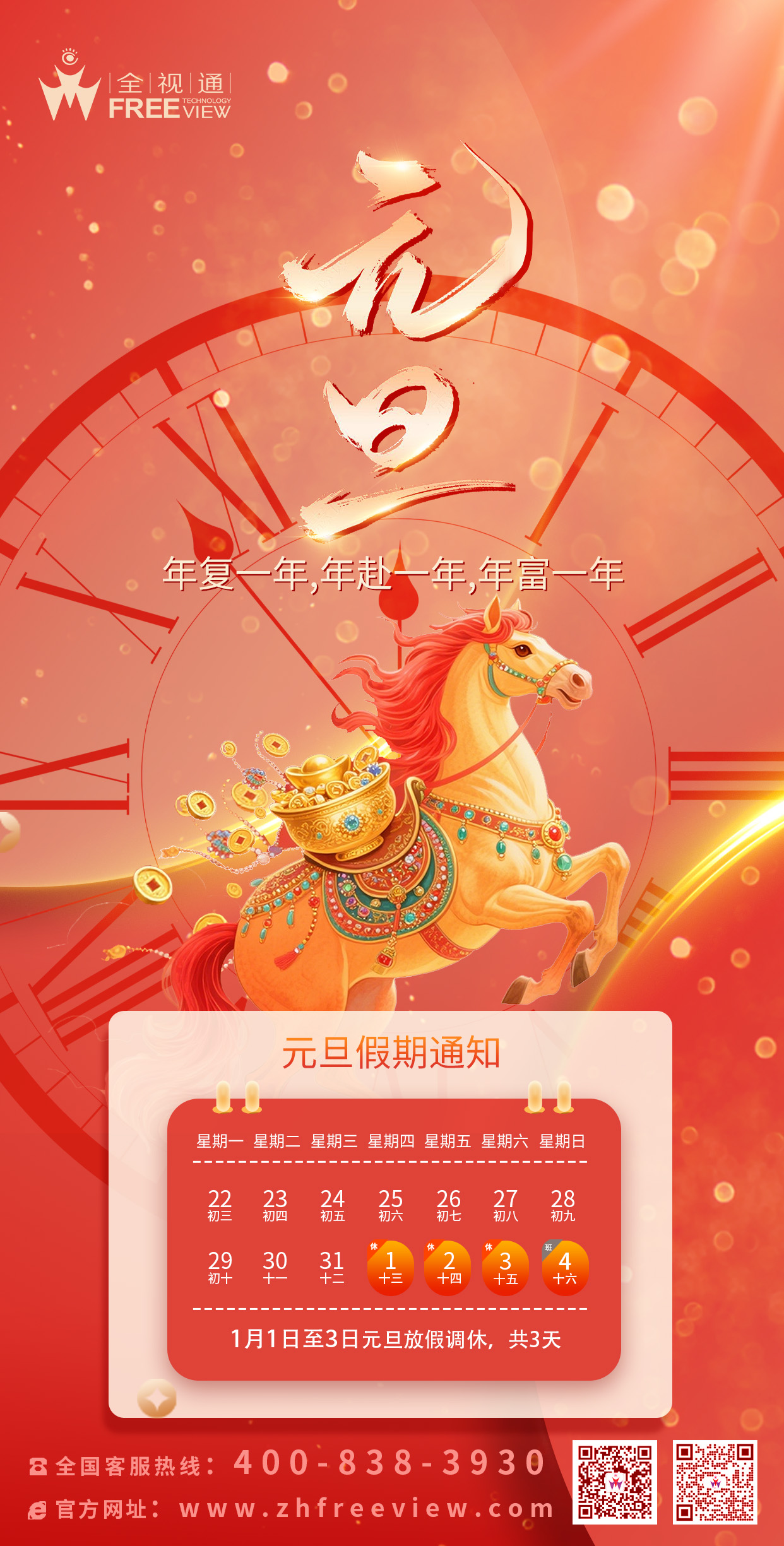你们好!年复一年,初心不改;年赴一年,步履不停;年富一年,幸福满盈。新的一年,全视通继续以梦为马,驰骋智慧医康养赛道,守护健康,以科技连接美好。根据相关政策通知和公司安排,现将元旦放假安排及有关事项通知如下: