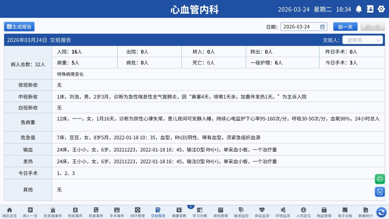 护理屏系统可汇总病区信息,自动引用入院登记、护理记录等数据,实现快速生成每日交班报告,替代了临床护理中的抄写、核对,减少错误、漏写等情况。系统可手动、自动定时发布公告通知、健康宣教,多种宣教模式协助完成宣教任务,全流程无纸化操作,让护理工作更加的便捷、高效。