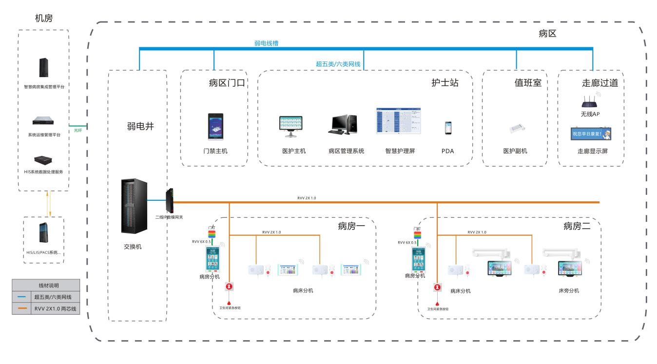 本系统为基于无线+二线(线路利旧)架构的智慧病房系统。