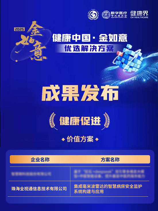 2025年“健康中国·金如意”优选解决方案成果正式发布,全视通凭借“集成毫米波雷达的智慧病房安全监护系统构建与应用”成果在高质量、高效率、高性价比、可持续性、可拓展性等方面的突出应用价值,获「健康促进」板块的价值方案奖。